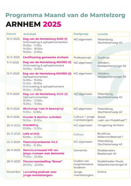 Elke dag zorgen ruim vijf miljoen mensen in Nederland, vaak onzichtbaar, vaak ongevraagd, voor een naaste. Ze combineren de zorg met werk, gezin of studie. Ze zijn onmisbaar voor onze samenleving en verdienen waardering. Dit jaar is het landelijke thema: “We zien je, we waarderen je!” In Arnhem waarderen we onze mantelzorgers, speciaal rondom de Dag van de Mantelzorg. In de hele maand november organiseren we leuke en leerzame activiteiten voor mantelzorgers (zie programma). Omdat het aantal mantelzorgers steeds verder stijgt, hebben we er dit jaar voor gekozen om meer mantelzorgers in het zonnetje te zetten. Daarom dit jaar geen grote centrale bijeenkomst maar een aantal intiemere bijeenkomsten met een cadeautje voor iedere geregistreerde deelnemer. In november ben je welkom op twee locaties in Arnhem. Drink een kop koffie of thee met iets lekkers en ontmoet andere mantelzorgers tijdens één van de ONTMOETINGSMOMENTEN. Het team van MVT Arnhem staat natuurlijk voor je klaar. Iedere geregistreerde deelnemer ontvangt het volgende cadeautje: